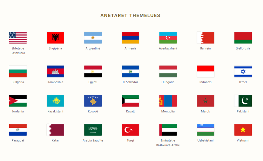 Ndër shtetet e listuara si anëtare përfshihen Shtetet e Bashkuara të Amerikës, Shqipëria, Kosova, Turqia, Arabia Saudite, Katari, Emiratet e Bashkuara Arabe, Pakistani, Izraeli, Egjipti, Jordania, Kazakistani, Uzbekistani, Paraguai, Maroku, si dhe vende të tjera nga Evropa, Azia, Afrika dhe Amerika Latine.