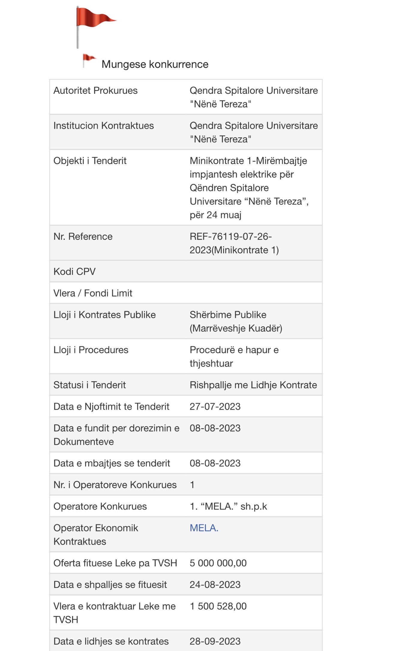 Kompanisë "MELA" të Lalës i është dhënë tenderi në shkelje të procedurave të tenderave publikë, i shënuar me flamur të kuq për mungesë konkurrence dhe rishpallje kontrate!