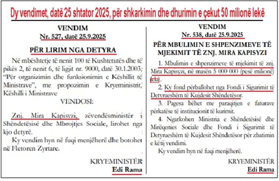 Më 25 shtator 2025, është firmosur Vendimi nr. 538, duke i akorduar 50 milionë lekë nga taksat e shqiptarëve ish-zv/ministres së Shëndetësisë, Mira Kapisyzi-Rakacolli, për një “trajtim shëndetësor jashtë vendit”.
