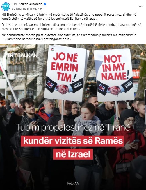 Media ndërkombëtare TRT Balkan ka pasqyruar zhvillimin e protestës së datës 30 janar në Tiranë kundër vizitës së kryeministrit Edi Rama në Izrael dhe takimit të tij me kryeministrin izraelit Benjamin Netanyahu, i cili është në kërkim Gjykata Penale Ndërkombëtare për krime lufte dhe krime kundër njerëzimit, për gjenocidin e shkaktuar në Gaza.